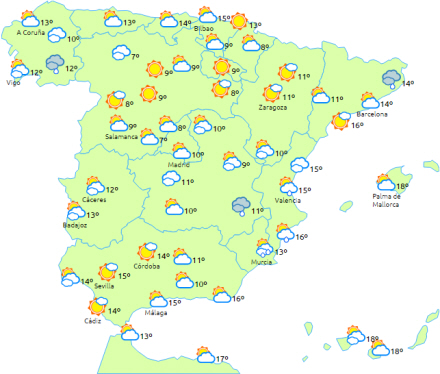 Overvejende skyet i den vestlige halvdel af halvøen, hvor der også kommer en del nedbør - lokalt tung eller vedvarende i det vestlige Galicien, Extremadura og Andalusien.