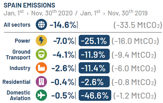 Blandt alle de lande, for hvilke der er offentliggjort data, registrerer Spanien det allerstørste fald i emissioner sammenlignet med 2019. Her er der frem til og med november nemlig registreret et fald på hele 14,6 procent, hvilket altså er tæt på det tredobbelte af det globale snit.