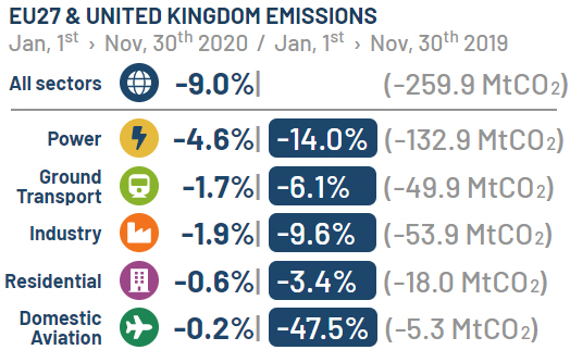 Den største bidragyder til dette fald er reduktionen i landtransport, som er faldet med 15,2 procent i forhold til 2019 og repræsenterer lidt over halvdelen af faldet i de globale emissioner.