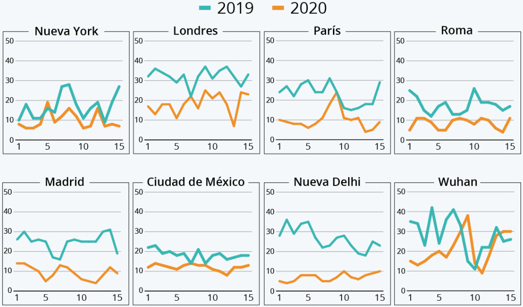 Niveauerne for nitrogendioxid, NO2, der er et af de primære forurenende stoffer, er faldet drastisk i byer som New Delhi, Mexico City, London, Paris, Wuhan, Rom og New York.