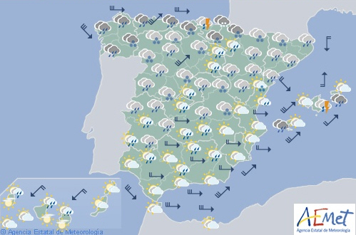 Et ny Atlanterhavsfront bevæger sig fra nordvest til sydøst og efterlader skyet himmel og nedbør til det meste af halvøen og Balearerne. Selv De Kanariske Øer får noget nedbør: