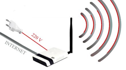 Boxen og antennen, der kun er illustrative, modtager både strøm fra stikkontakten og signaler fra internettet. Internettet omdannes som af en normal router til WiFi-bølger. 220 V-strømmen omdannes i boxen til jævnstrøm, der herefter “bæres” af WiFi-bølgerne