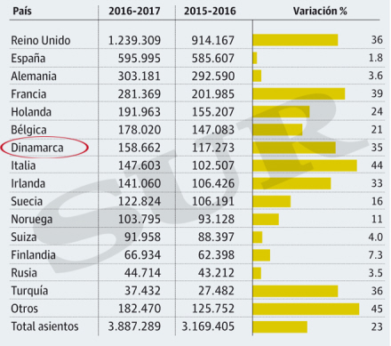 De gule streger til højre viser fremgangen i forhold til vintersæsonen 2015-2016 (Diariosur.es)