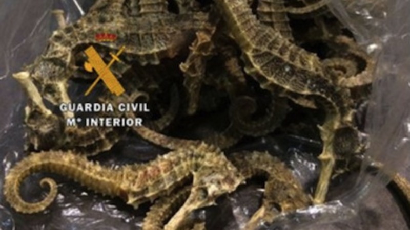 Guardia Civil oplyser, at søhestene blev opdaget i plastikposer skjult i en kinesers kuffert, der var ankommet til Malaga Lufthavn fra Cali i Colombia.