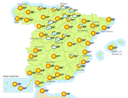 Fem regioner er i dag i gult alarmberedskab (risiko), mens fem andre er i det næsthøjeste, orange (væsentlig risiko) på grund af varme. Sådan lyder dagens varsler i korte træk fra Meteorologisk Institut, Aemet, der har udstedet generelt hedebølgevarsel for hele landet undtagen Cantabrien, Galicien and De Kanariske Øer.