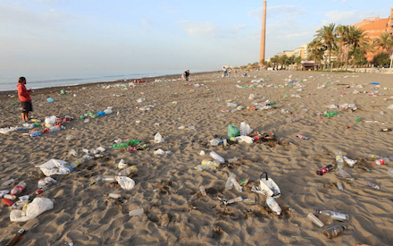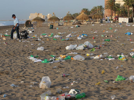 Málagas strande ved daggry var et sørgerligt syn fuld af affald og folk, der tilbragte natten i det fri på stranden.