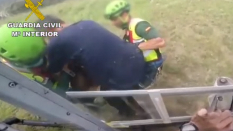 Han blev sammen med sin hund evakueret i en Guardia Civil-helikopter til byen Riaño, hvor en ambulance ventede på at køre ham til hospitalet i León.