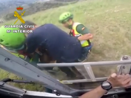 To bjergreddere fra GREIM-gruppen i Sabero, León, blev fløjet til stedet i en helikopter. Da de fik øje på den sårede, hejste de sig ned og fik sat en skinne på på den brækkede ankel. Der var tale om et åbent brud.