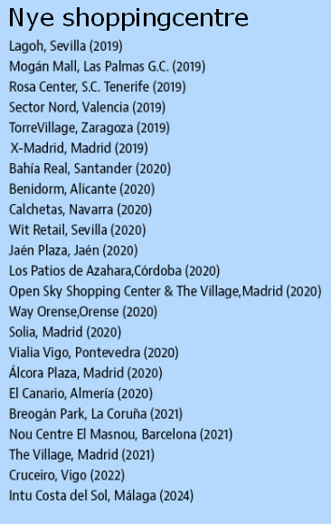I øjeblikket har Spanien 563 centre, der breder sig på i alt 16 millioner m2, og i de kommende år det altså vil stige betydeligt, da det forventes, at 23 nye indkøbscentre slår dørene op fra 2019 til 2024. Det betyder yderligere 1.000.000 m2 forretningsareal.