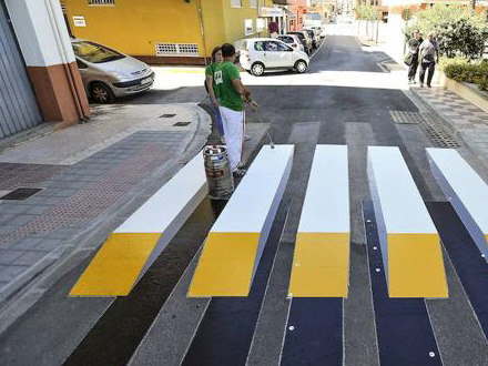 Man laver fodgængerfeltet ved at varme vejen op og påsætte små stykker plastik, som altså snyder øjets opfattelse af, at den er plan.
