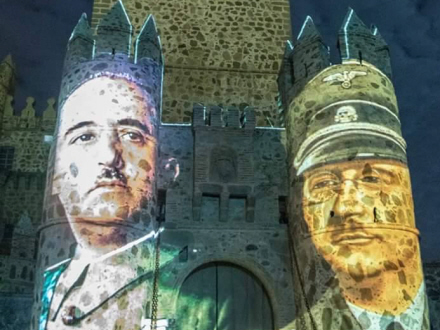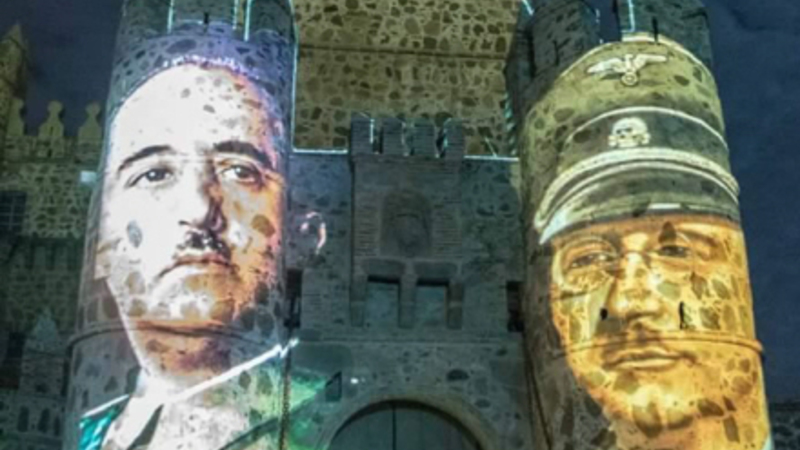 SAMFUND: Kæmpe lysshow med billeder af diktatorerne Francisco Franco og Adolf Hitler har skabt stor polemik i Spanien.