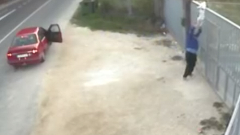 VIDEO: Politiet jagter to mænd, som blev filmet af et overvågningskamera, da de smed en lille hvalp over hegnet til et dyreinternat, inden de stak af.
