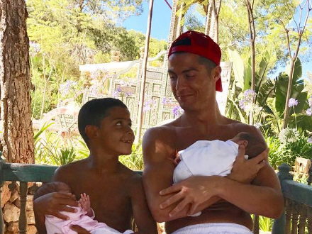 7-årige Cristiano Jr. holder sin lillesøster, mens Real Madrid-stjernen selv holder Mateo.