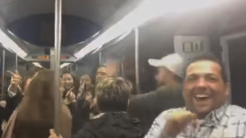 Rendyrket glæde i Metroen i Madrid, hvor en populær popsang tager fart og får alle med. En af passagererne optog det hele med mobilen.