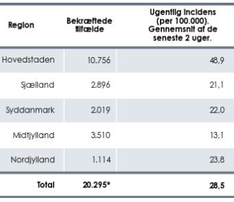 “Incidensen i Danmark vises ikke længere tabellen, der viser det aktuelle ugentlige antal sygdomstilfælde per 100.000 indbyggere for de seneste to uger for hvert land i EU, Schengenområdet samt Storbritannien. Dette skyldes at formålet med tabellen er, at vise risikoen for danskere der rejser ud og ikke omvendt.”