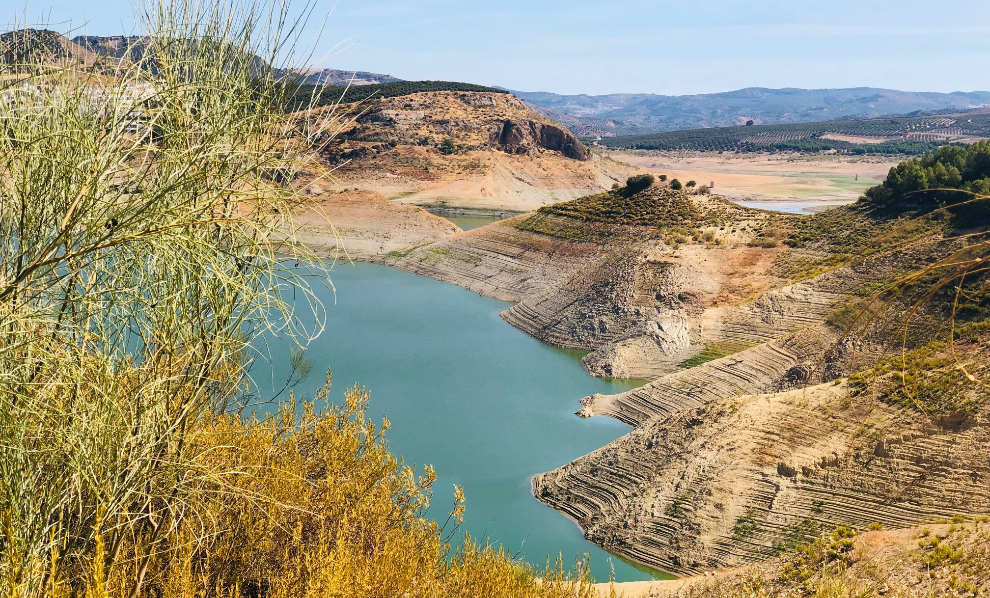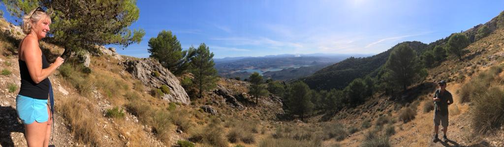 Vi puster, stønner og holder en del vandpauser, og en time senere er vi endelig oppe. Puha, den trak lidt tænder ud. Men udsigten er fantastisk, og vi kan se ned til det meget lavvandede vandreservoir Pantano de Iznájar.