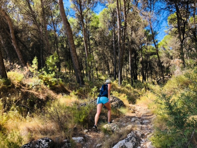 Efter ti minutter med solid stigning på asfaltvejen, starter stien til venstre. Herefter yderligere ti minutter op-op-op gennem et skovområde. Så går det lige lidt lettere lige ud ad en dejlig grusvej, men så drejer vi igen fra og op på en skovsti. Og så går det opad for alvor!