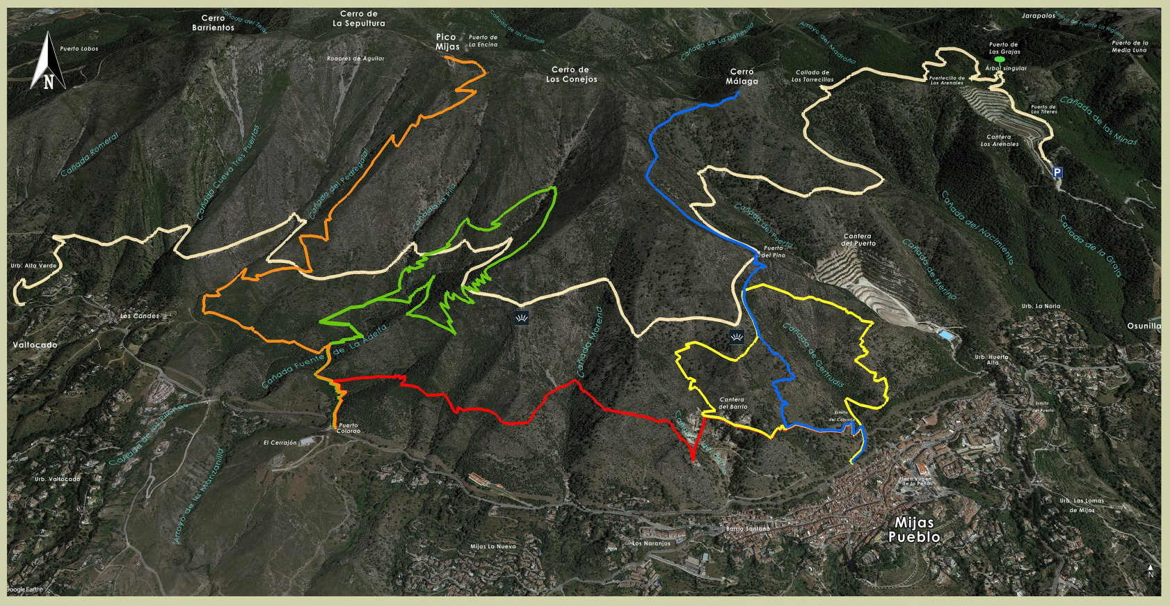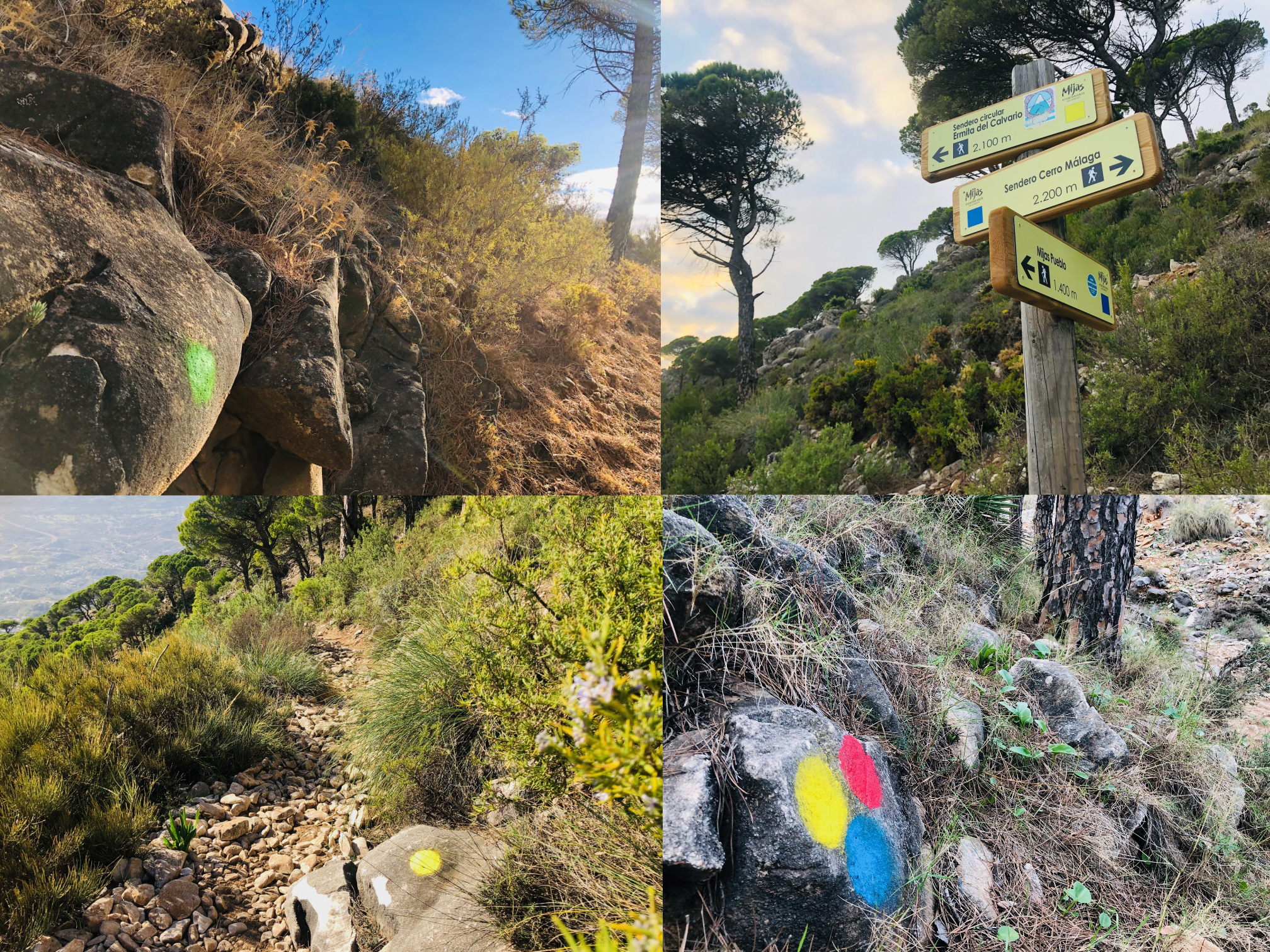 På bjerget lige oven over turistperlen Mijas Pueblo er der seks forskellige ruter at vælge imellem og to forskellige steder, man kan starte fra. Så kan man for eksempel vælge at gå lidt af den orange, indtil man rammer den lysegule og fortsætte ad den, indtil man rammer den grønne og så gå tilbage til udgangspunktet ad den.