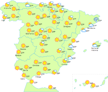 I dag trækker en Atlanterhavsfront ind, og den giver skyet eller overskyet himmel i nordvest og det nordlige Navarra med svag regn, men det klarer op i eftermiddag.