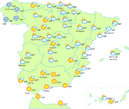 Dagstemperaturer stiger på De Kanariske Øer og i den nordvestlige tredjedel af halvøens Middelhavsområde. Få ændringer på Balearerne og faldende temperaturer i resten.