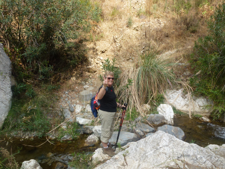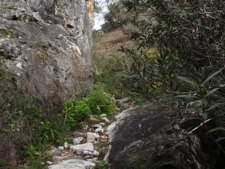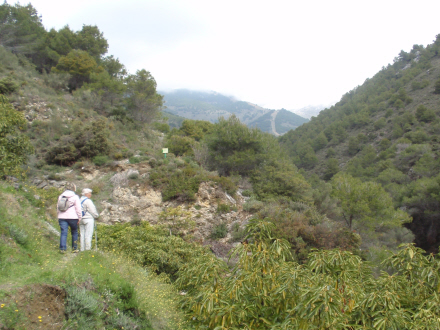 Vi går nu på kanten af en lille slugt langs med en bæk, der løber ned i Río Cájula. Der er ret flot her, for dels er stien dramatisk, og dels har vi en betagende udsigt op mod bjergene i naturparken 'Sierra de Tejeda, Almijara og Alhama'.