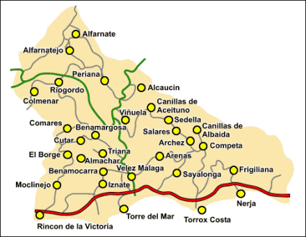 Kort over landsbyerne i La Axarquía, øst for Málaga