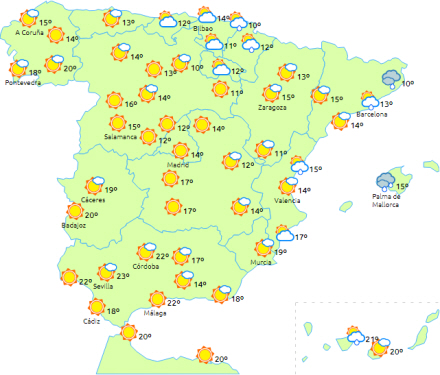 I den nordøstlige del af halvøen og på De Baleariske Øer er der overskyet himmel med lejlighedsvise byger ledsaget af torden, der også i mindre intensitet kan brede sig til De Iberiske Randbjerge og den øvre Ebro-dal.