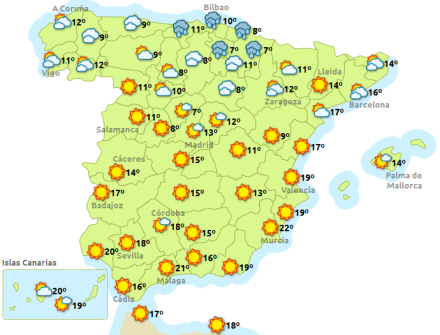Temperaturerne stiger i det meste af landet, særligt i Levanten og langs Murcias kyst, den sydlige del af Ebro-dalen og De Kanariske Øer. Op til syv grader varmere i Alicante, seks i Jaén, fem i Valencia og fire i Albacete, Castellón, Murcia, Palma de Mallorca, Teruel, Toledo og Zaragoza.