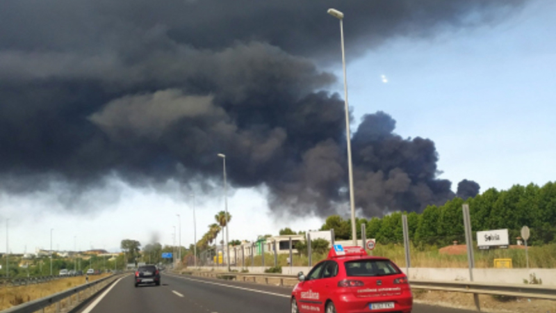 VIDEO: I går gik alarmen på Spaniens sydspids, da der pludselig bredte sig en fæl lugt af brændt plastik, og kulsort røg skyggede for solen. Folk blev rådet til at holde sig indendøre, men heldigvis kom der hurtigt styr på branden.