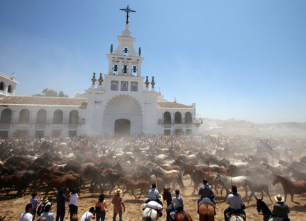 Flokken på flere tusinde heste passerer kirken med Rocíos Jomfru María for at blive velsignet af præsten. Derefter drives dyrene til hestemarkedet i Almonte. Efter nogle dage vender hopperne tilbage til Nationalparken, hvor de så lever i frihed til næste år.