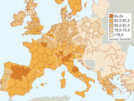 Madrid, Castilla y León og Navarra er de områder med højest forventede levealder i Europa sammen med et enkelt område i Frankrig og et par stykker i Italien. Her lander vi inden for kategorien over 94 år.
