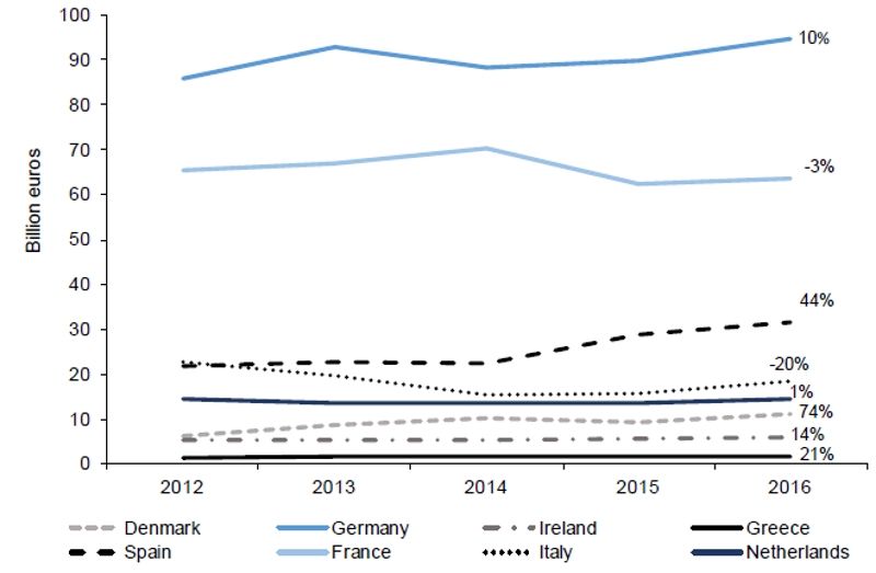 I 2012 brugte italienerne 22,8 milliarder på ferien, hvor spanierne kun brugte 21,8 milliarder. Siden da og frem til 2017 slankede italienerne feriebudgettet med 20 procent, mens altså spanierne skruede op for det med 44 procent. Det var dermed langt over tyskernes stigning på 10 procent, mens Frankrig registrerede et fald i tre procent.