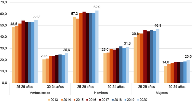 I alt boede 55,0 procent af de unge i alderen 25 til 29 stadig hos deres forældre.