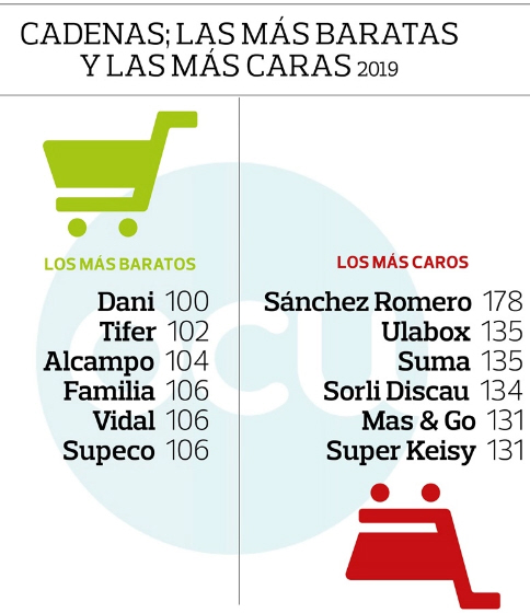 De billigste lokale kæder er Dani og Vidal, mens de billigste regionale kæder er Tifer og Familia.