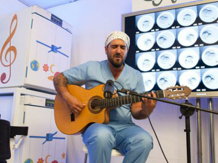 Iklædt blå klinikkittel og -bukser, kirurg-hat og akustisk guitar gav han intimkoncert på Institut Marqués i Barcelona.