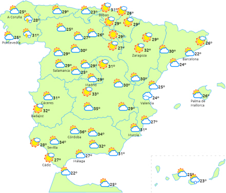 Regn- og tordenbyger, der lokalt kan være ret kraftige i Galicien, Asturien og Guipuzcoa. Perioder med stærk vind på halvøens nordvestlige del, i Cádiz og bjerge i områderne. Betydelig høje temperaturer på både halvøen og Balearerne.