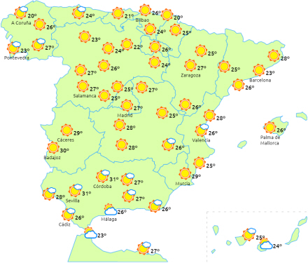 På halvøen og De Baleariske Øer er himlen letskyet eller klar og bliver kun afbrudt af nogle højtliggende skyer af og til, mens der efterhånden kan være noget skydannelse i de indre områder.