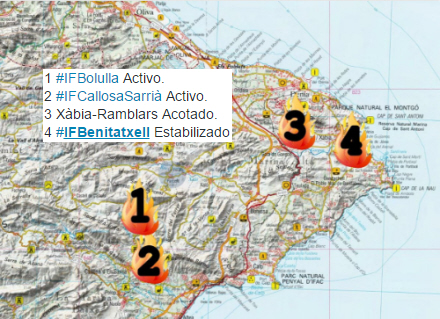 Brandene i Benitatxell og Jávea (henholdsvis nummer 3 og 4 på billedet herunder) blev meldt stabiliseret klokken 20:21 tirsdag. Det vil sige, at de er 'flammeløse', og man har en vis form for styr på dem, uden dog at have dem decideret under kontrol.