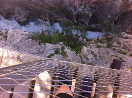 Broen er bygget parallelt med den gamle bro, der krydser kløften. Et skilt advarer om, at der højst må opholde sig 10 personer på den ad gangen, men det er tilsyneladende en lidt for kompleks besked for mange, der bare vader ud på den. Gys!