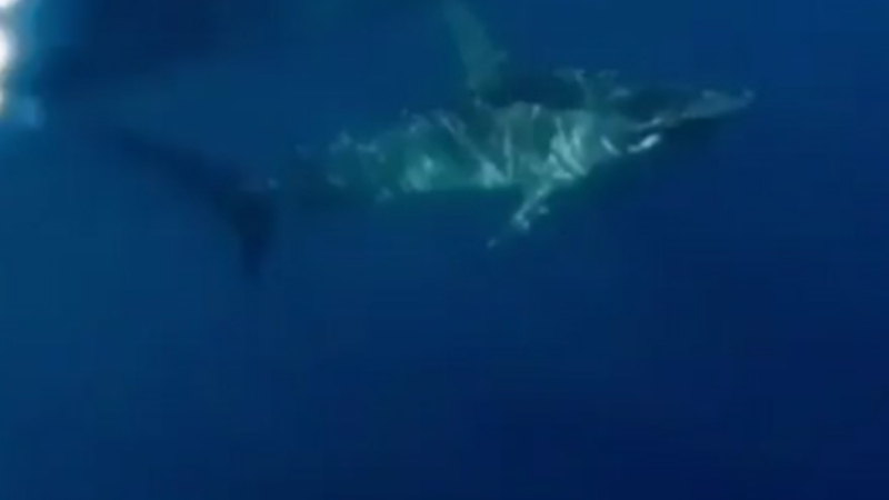 Pludselig spottede han skyggen af noget ret stort i vandet, og han skyndte sig at starte kameraet og stikke det under overfladen. Og det, han så som en utydelig skygge over vandet, viste sig at være noget, mange har mareridt om. En kæmpe stor haj.