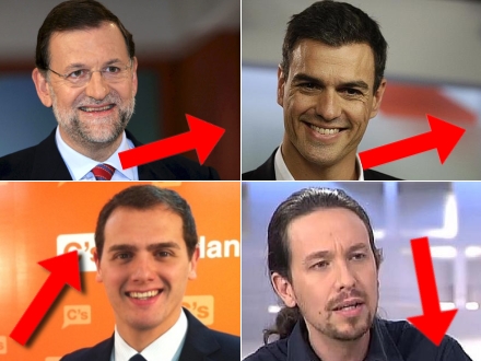 Det helt store smil finder vi hos lederen af Ciudadanos, Albert Rivera, der i samme periode får en fremgang fra 11,1 til 14,7 procent. Dermed placerer den populære partileder sig som landets tredjestørste parti.