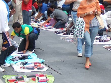 Der er tale om ulovligt gadesalg, og det er da også grunden til, at alle varerne er spredt ud på jorden ovenpå et stort lagen med snore i hjørnerne - så kan sælgeren nemlig lynhurtigt trække i snorene, samle alle sagerne og spæne væk, hvis politiet kommer.