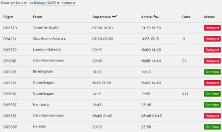 Eksempelvis ankommer flyet fra København i Málaga i dag indtil videre halvanden time forsinket - det ankommer dog, og det er trods alt bedre end mange, der skulle have været af sted i går med Ryanair, som slet ikke kom af sted. Det vidnede adskillige opslag på facebook i går om, hvor familie og venner måtte vente med at komme på påskeferie i Spanien.