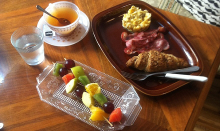 For 20 euro får du: Kaffe, te, frisk juice, kager, brød med Philadelphia, Nutella, marmelade, tomat og olivenolie, æg, laks, landskinke, salater og græsk yoghurt med honning og müesli.