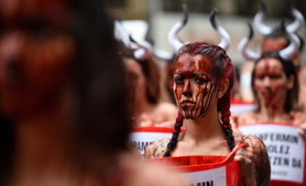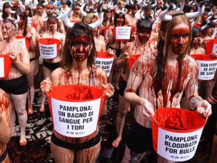 Tirsdag smed knap 100 aktivister fra dyrerettigsheds-gruppen PETA, People for the Ethical Treatment of Animals, og Anima Naturalis tøjet i Pamplona og smurte sig ind i falsk blod for at vise deres store utilfredshed med tyreløbet, skriver The Local.
