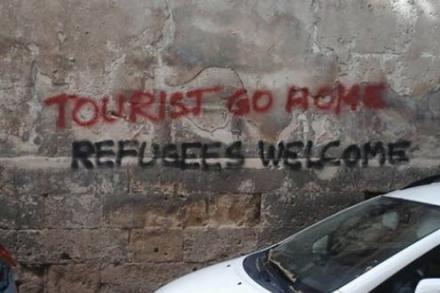 "Turister tag hjem. Flygtninge er velkommen" og ”turisme ødelægger vores by,” er bare nogle af de sloganer, der er blevet skrevet med grafiti omkring byens gotiske katedral for nyligt.