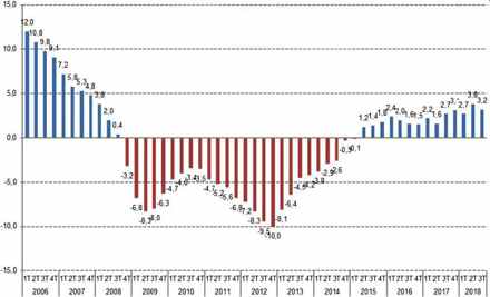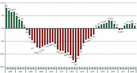 Grafikken viser, at efter fald i 26 kvartaler i træk siden 2008, har der nu været stigninger 14 kvartaler i træk siden 2015