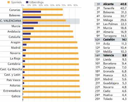 Blandt provinserne fremhæves Alicante's stærke position med en udlændinge andel på 40,7 procent efterfulgt af Tenerife, Balearerne, Girona og Málaga.