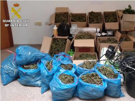 Guardia Civil vurderer, at der var for 150.000 euro stoffer i huset, og det derfor på ingen måde kan regnes for at være til eget forbrug. I alt beslaglagde politiet 34 kilo tørret marihuana, vægte, gødning, potter samt et vandingsanlæg.