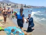![]() | VIDEO: Iført jakkesæt og redningsvest ankom en mand til stranden på en vandscooter. Blandt alle strandgæster gik han på knæ i sand og vand for sin kæreste, der var på arbejde som strandvagt. |